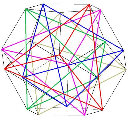 Finally, let us demonstrate how the dodecahedron may be constructed from the interlocking vertices of 5 tetrahedron. We have already seen how the cube fits inside the dodecahedron, and how 2 interlocking tetrahedron may be formed from the diagonals of the cube. As Buckminster Fuller has pointed out, however, the cube and the dodecahedron are structurally unsound unless bolstered by the additional struts supplied by the tetrahedron. Fuller concludes logically that the tetrahedron is the basic building block of Universe; yet it is the dodecahedron that provides the blueprint and forms the structure for the interlocking tetrahedrons. The dodecahedron unites the geometry of crystals and lattices (root 2 and root 3) with the geometry of Phi (root 5), found in the biology of organic life.