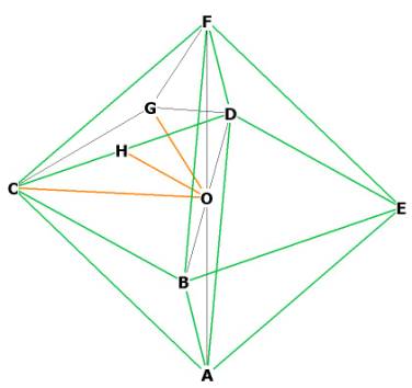 The octahedron consists of 2 pyramids, face-bonded. One pyramid is at A-BCDE,