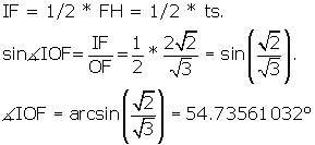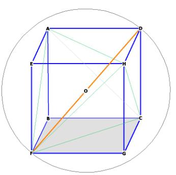 What is the relationship between the side of the tetrahedron and the radius of the enclosing sphere? We want to know the relationship between OF and FC.