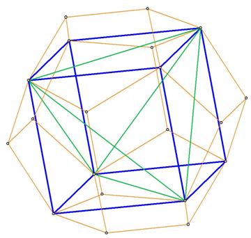 Cube and tetrahedron in dodecahedron. Cube in gray, tetrahedron in green